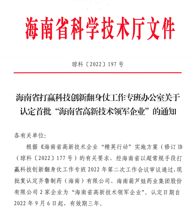 近日,海南省科学技术厅发布的《海南省打赢科技创新翻身仗工作专班办公室关于认定首批“海南省高新技术领军企业”的通知》中显示,批复认定海南彩虹多多官网药业集团股份有限公司等2家企业为“海南省高新技术领军企业”。认定日期自2022年9月6日起,有效期三年。